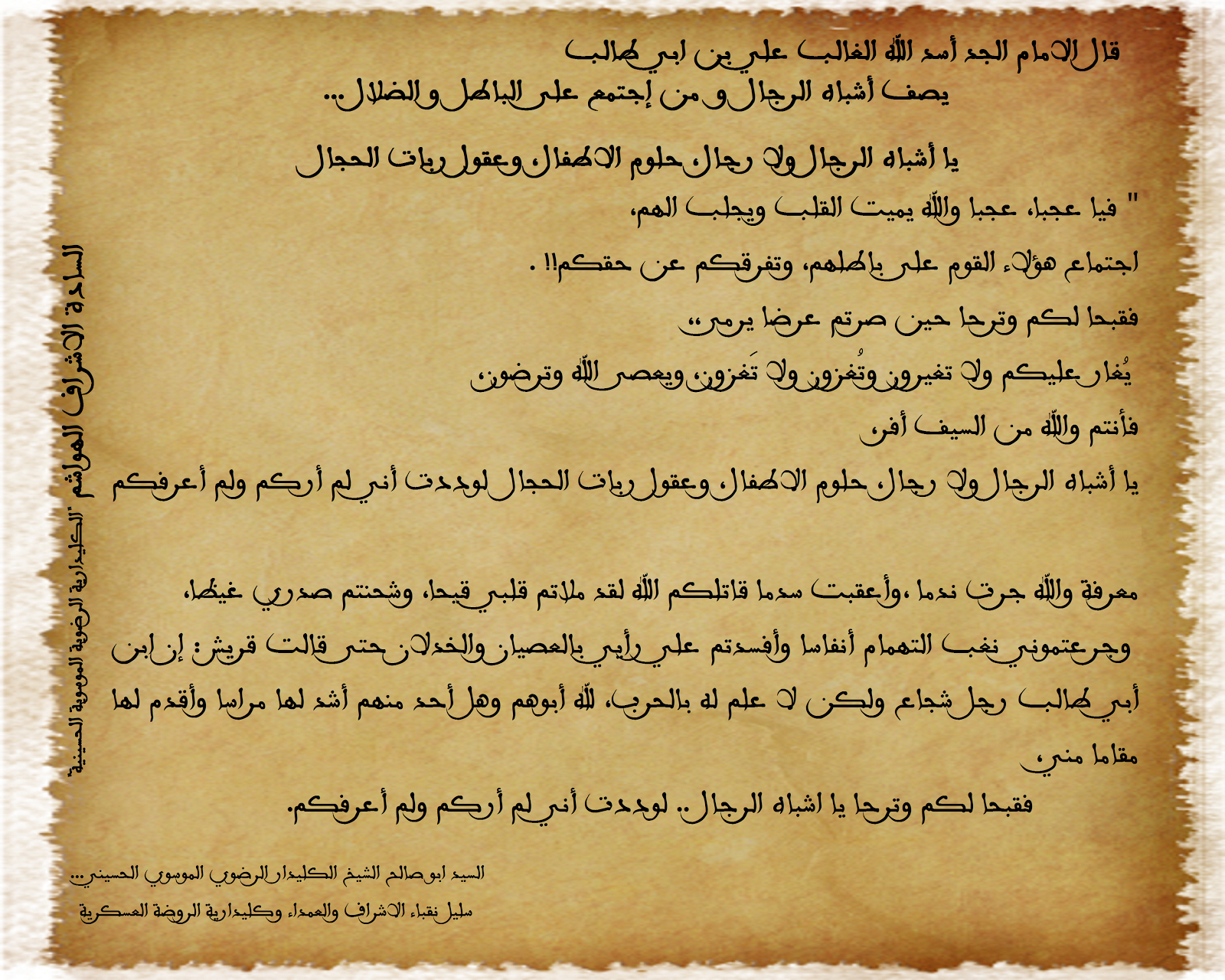 السادة الأشراف الهواشم آل صالح الشيخ الكليدار الرضوية الموسوية الحسينية العلوية الطالبية الهاشمية قال الإمام الجد اسد الله الغالب علي بن ابي طالب يصف أشباه الرجال ومن اجتمع على الباطل والضلال