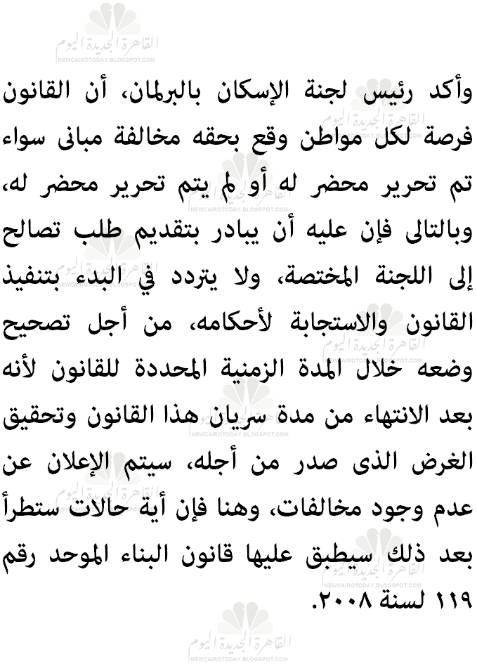 القاهرة الجديدة اليوم رئيس لجنة الإسكان بالبرلمان سريان قانون التصالح في مخالفات البناء بعد العيد ومن حق من لم ي حر ر له محضر بالمخالفة أن يتقدم للتصالح أيضا وعلى المخالفين تصحيح أوضاعهم خلال